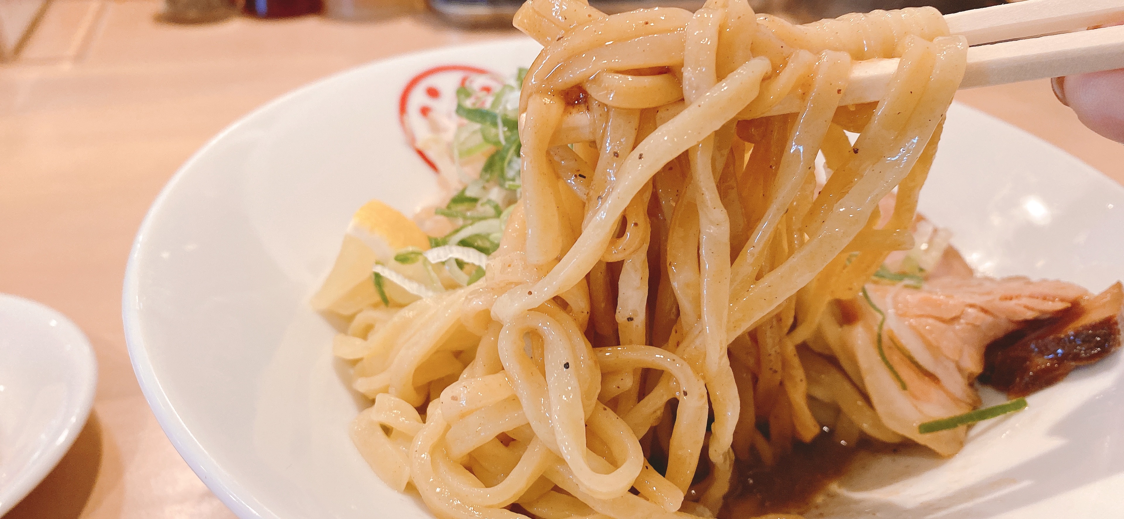 深めの器に、平打ちの麺の上にチャーシュー、レモン、奥にはメンマ、もやし、ネギが乗っています。