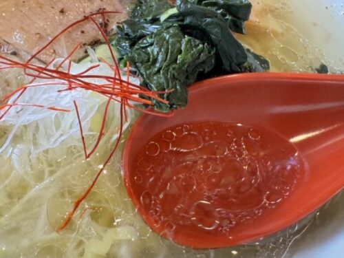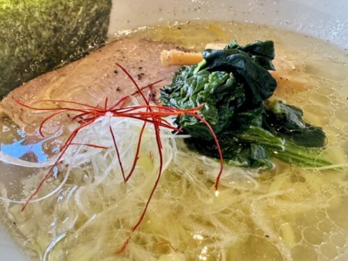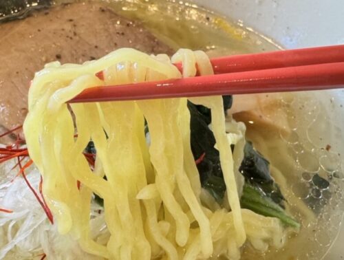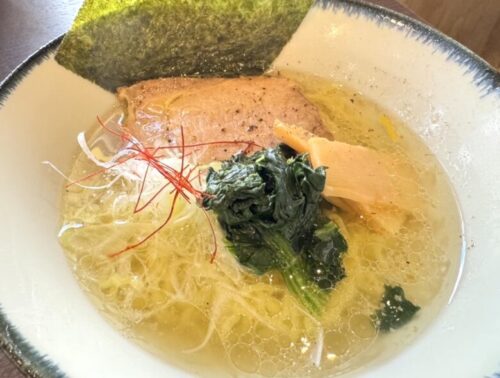 きれ~い。塩ラーメン(850円)。きらきらとしたスープは天草の塩に鶏肉、豚肉、お野菜で出汁をとっているそうです。
