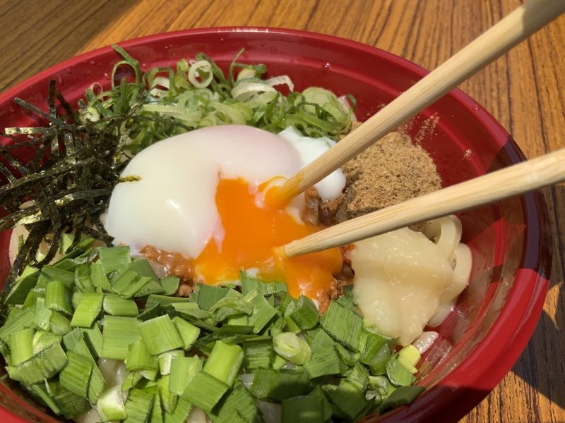 肉味噌の旨味に、薬味の風味、そしてたまごのまろやかさが最高の組み合わせで美味。