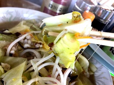 上に盛られたお野菜類をかき分けて、ようやくチャンポン麺が出てきました!