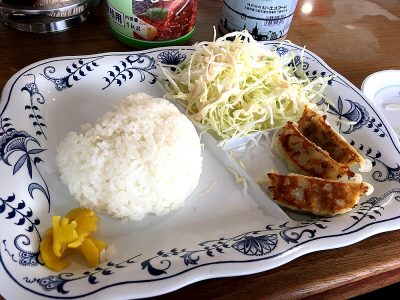 今回はチャンポンセットで頼んでみました。セットには、ライス、餃子、お野菜、漬物が付きます。