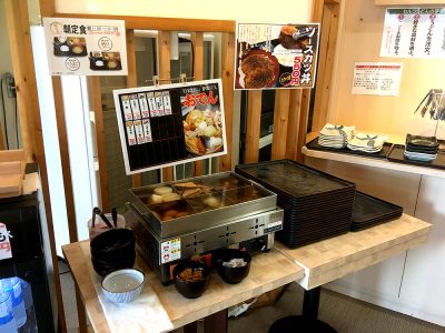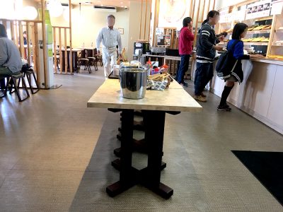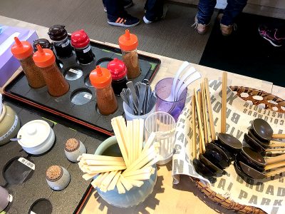 お店の中央あたりに、ネギや天かす、調味料などが設置されたテーブルがあります。