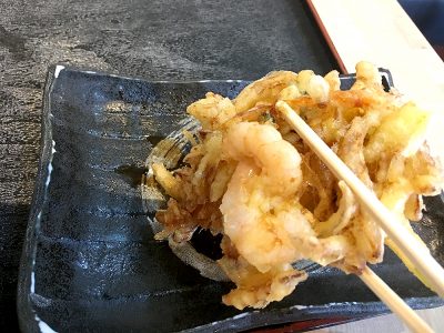 そして注文品を待つ間、“食事前の軽いおつまみ”として海老野菜かき揚げを頂きます。