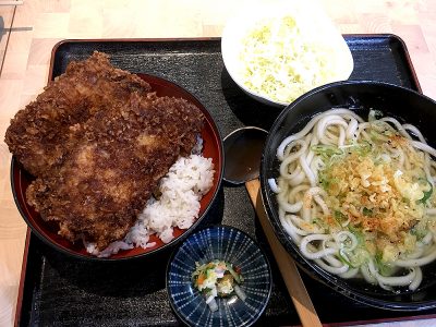 この大きいカツが二枚も乗っている丼に、かけうどんの量も多いですね。