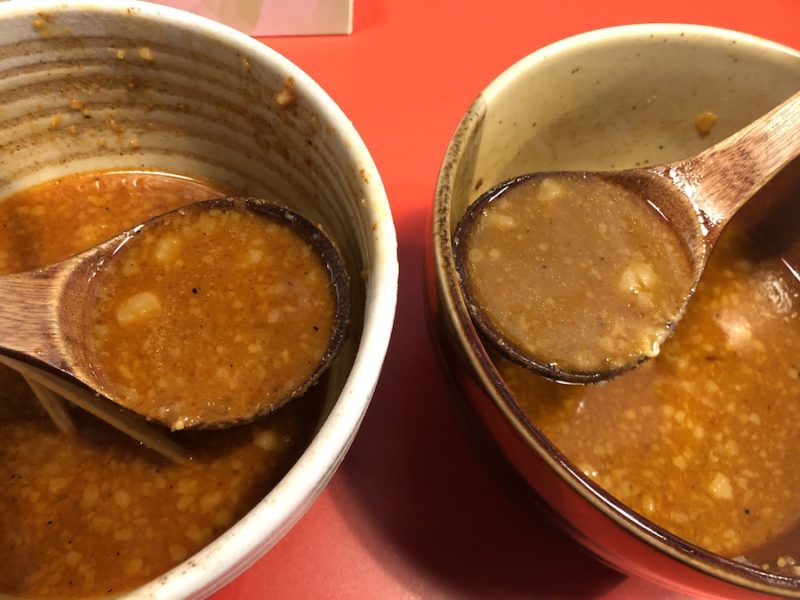 スープだけ並べてみると辛味噌オロチョンラーメンが、いかに辛いかを物語っています。辛い食べ物が大好きな私も最後は唇がヒリヒリしていました。