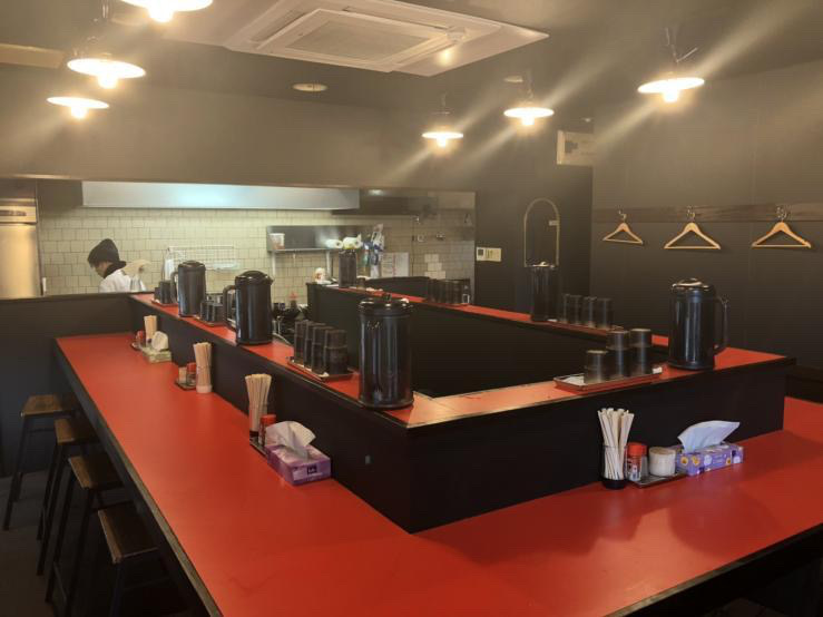これぞラーメン屋というような、コの字型のカウンター席。また、赤と黒を基調とした店内は、オレンジ色の照明と相まってなんともお洒落。厨房は、席で囲うスタイルではなく奥にありました。