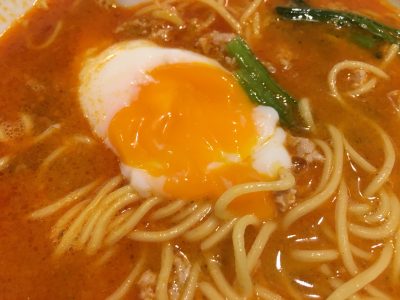 こちらが汁あり担々麺の中辛に温玉トッピング。これで650円とお得です。