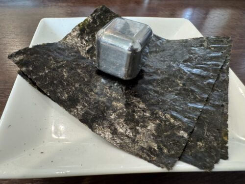海苔が来ました。結構大きな海苔です。私はラーメンに浸して食べるので、「干し海苔」にしました。