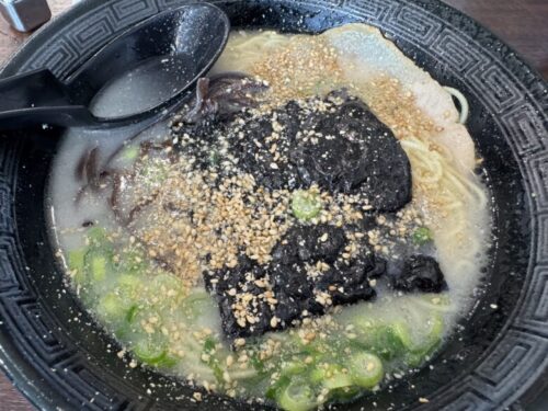 残りの海苔と、胡麻を入れ、胡麻の風味ととんこつ味と海苔を味わいます。