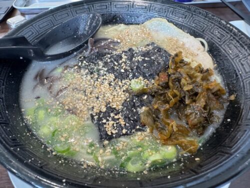 いやぁ、味変が贅沢に楽しめます。とくに、からし高菜がすっごく美味しいです。ぴりりと辛さが利いていて、替え玉(150円)したくなる事間違いなし。からし高菜はとても人気があり、お持ち帰りパックも売れているそうです。