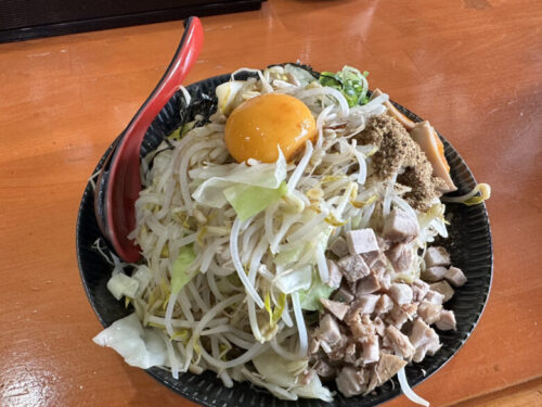 野菜多めの特性油そばを注文!味玉トッピングしたのですが、生卵が付いていました!