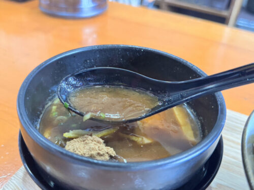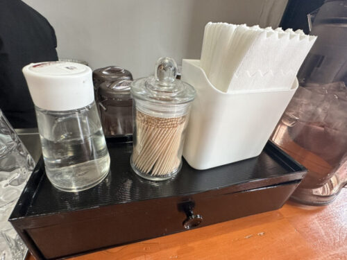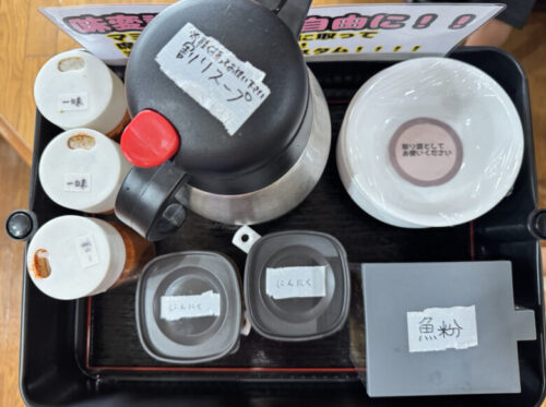 店の中央に調味料コーナーでは、にんにくや追い魚粉などがあり味変もできますよ!