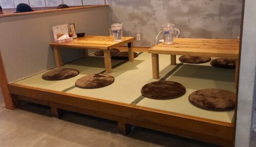 長いカウンターとテーブル、小上がりがある店内。