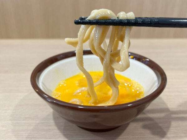 麺に絡まったスープの味はそのまま強く残ったままで生卵がうまく調和しています。これは…めちゃくちゃあり!
