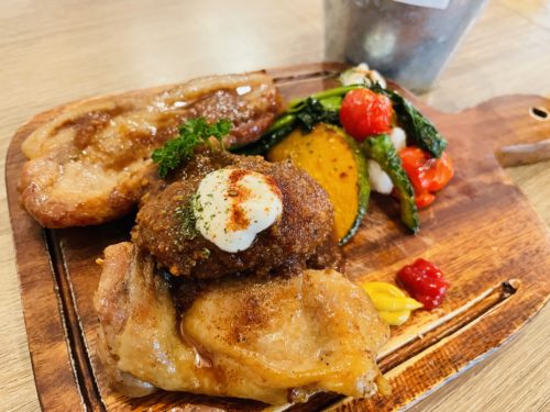 「手ごねハンバーグ、ポークステーキ1/2、グリルチキン、季節のグリル野菜マッシュ添え」