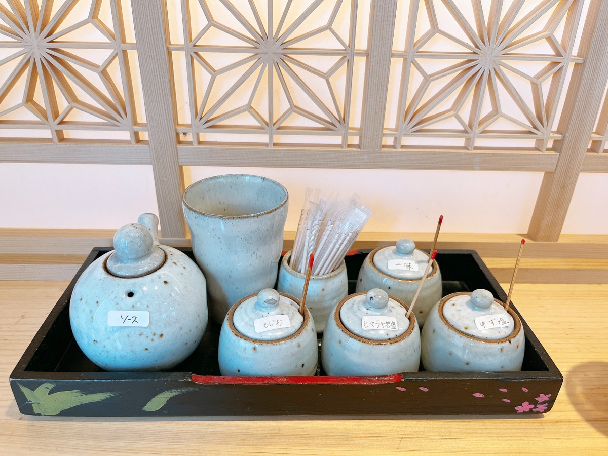 お席にも塩3種類とソース、一味があるのでお好みでどうぞ。