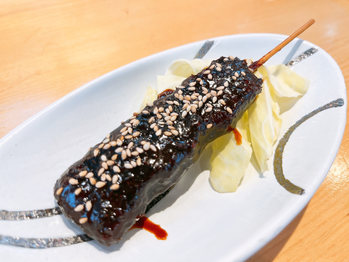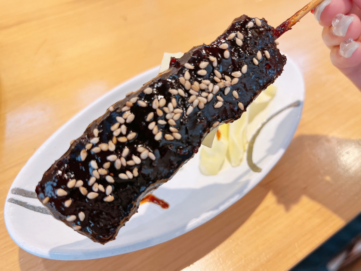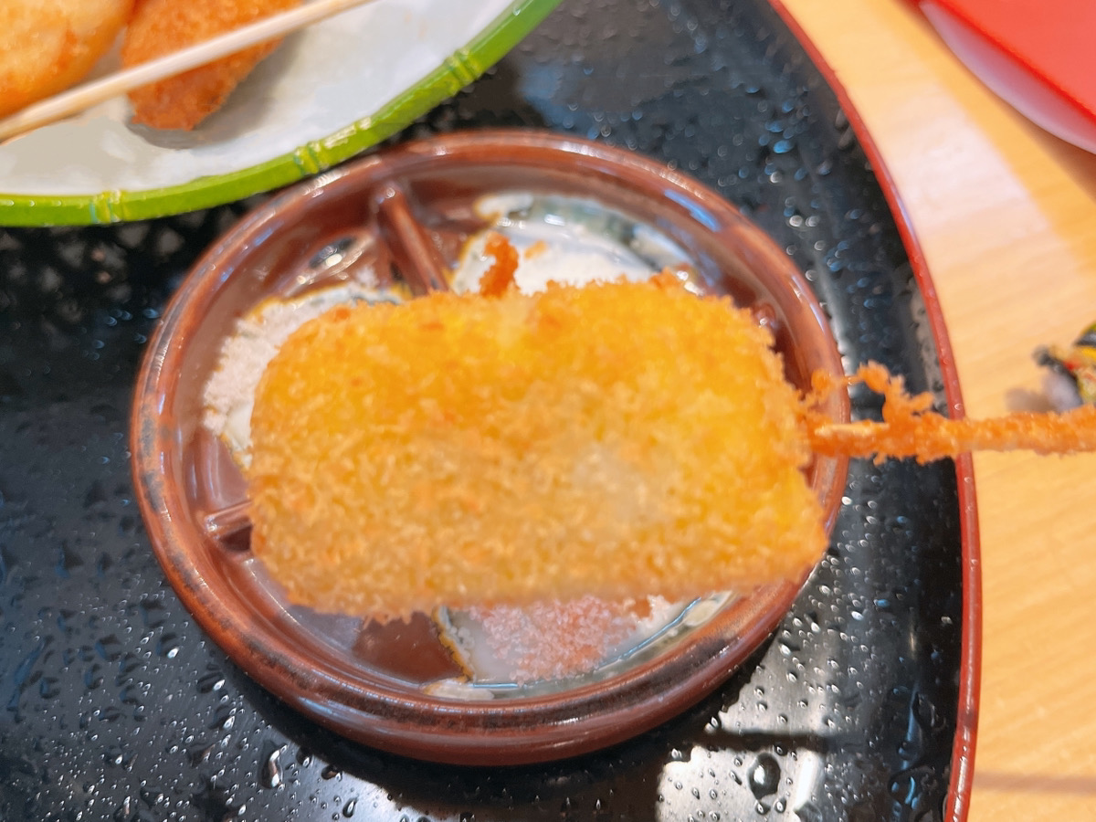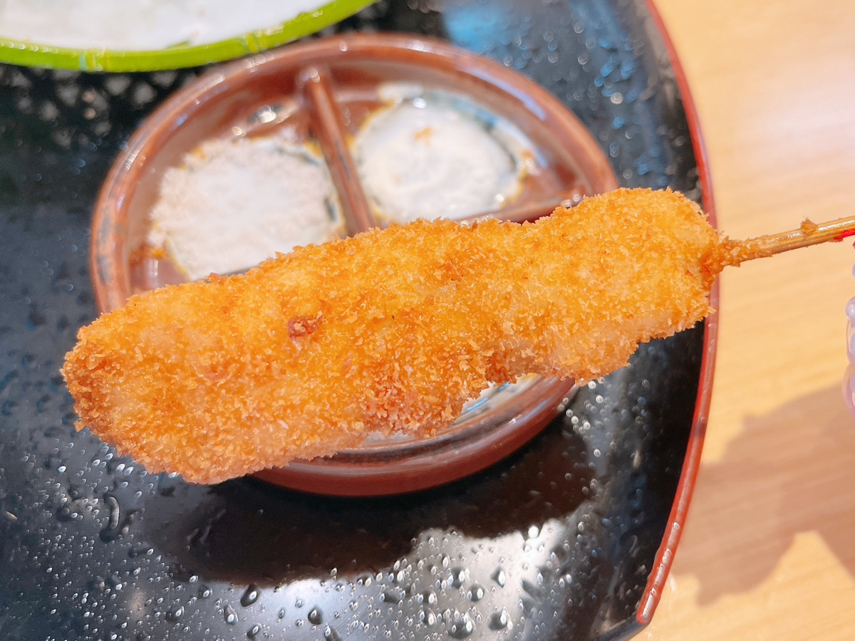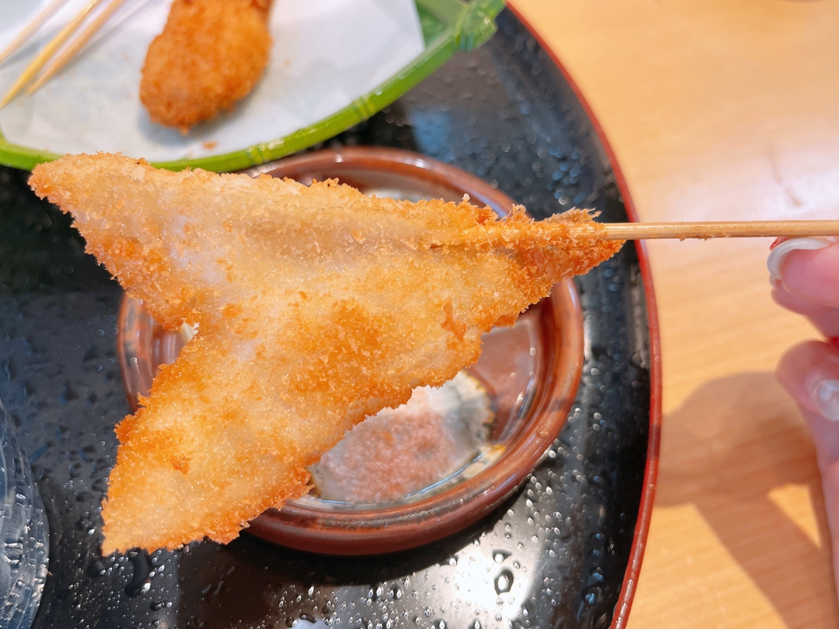 3本目、お麩。お麩の串揚げって初めてでしたが、合う!サクサクともちもちの食感のコントラストが面白い1本でした。