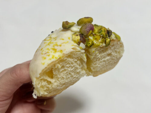 最後はピスタチオとレモン。ドーナツの上にホワイトチョコレートが掛かっており、さらにピスタチオとレモンの皮が乗っています。