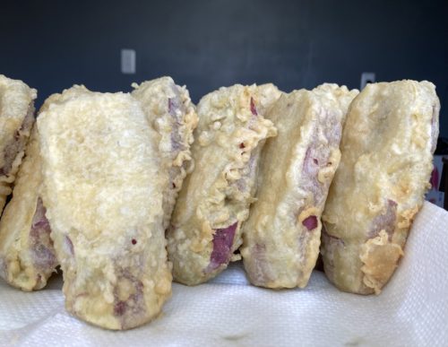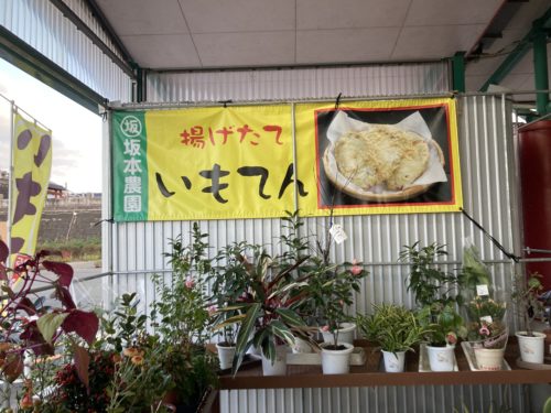坂本農園の唐芋を使ったいも天屋。いかがでしたか。買いにきているお客さんに話を伺うと、「こんなに美味しい唐芋は他には無か!」とのこと。ファンの方も多いそうで、小学生の子どもからお年寄りの方まで買われていました。「5個ください!」など1人でたくさん頼む方が多い印象でしたよ。1個100円なのでついつい多く買ってしまいそうですね!