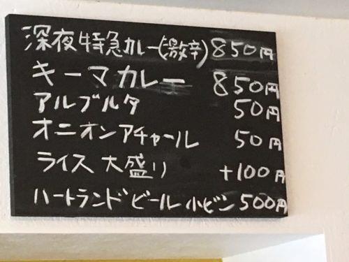 カレーは深夜特急カレーとキーマカレーの2種類のみ。アルブルタとオニオンアチャールは付け合わせになります。おいしいからこそこれだけで勝負できる、シンプルなメニューです。