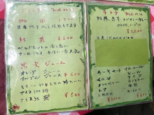 メニューは珈琲や紅茶、ジュースにケーキ、ランチは阿蘇赤牛スパイシーカレーが用意されています。