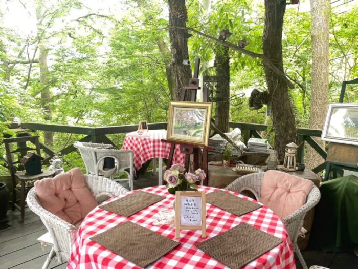 木立ちの緑の中に赤いチェックのテーブルクロスが映える、心地よい空間です。