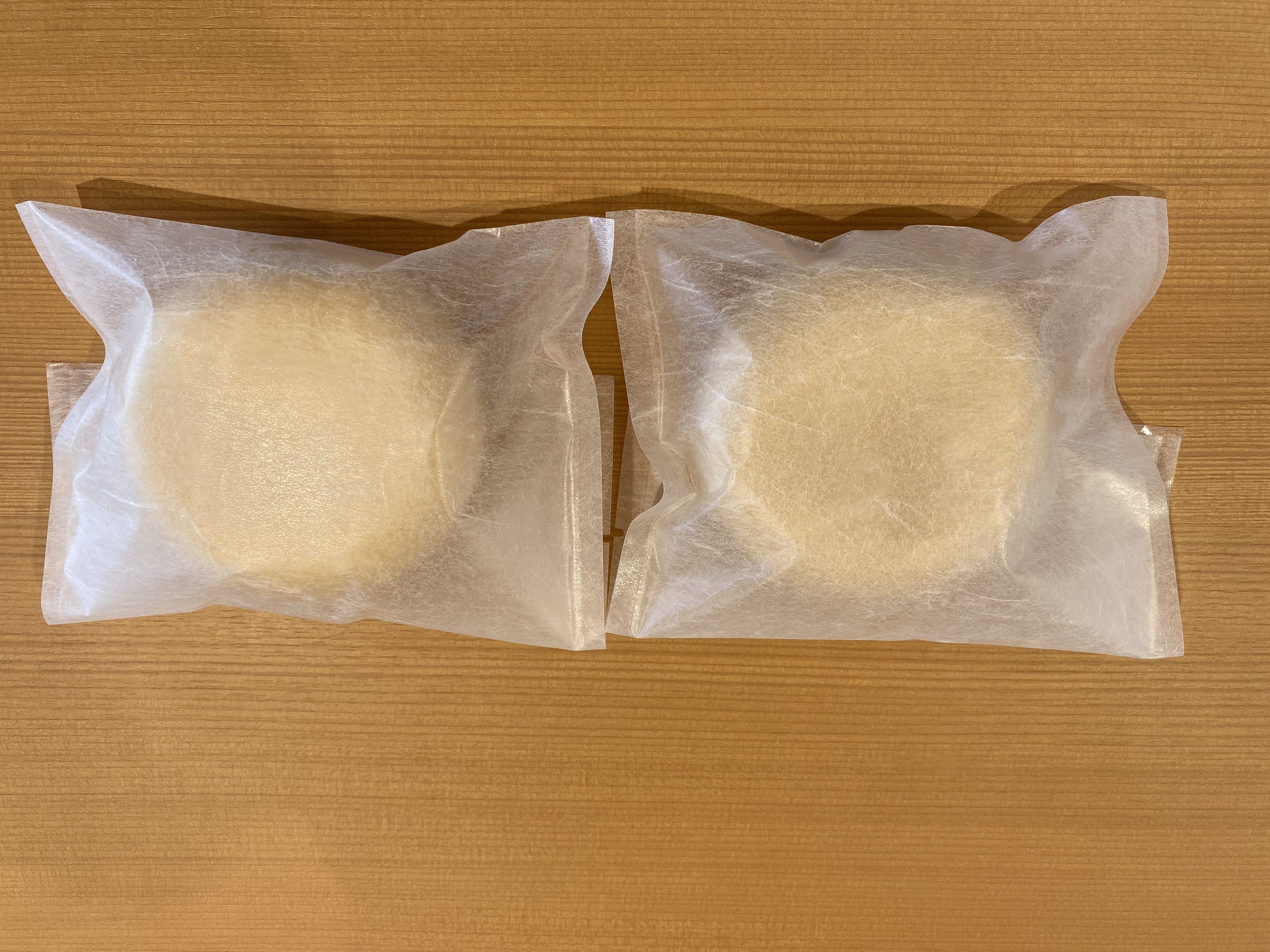 奥の白いほうが「みそ」味。手前の少し茶色いほうが「しょうゆ」味です。