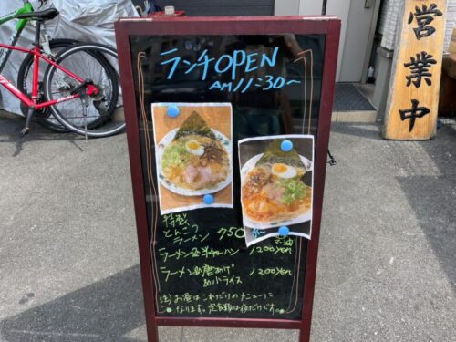 看板には特製とんこつラーメンの写真と、「お昼はこれだけのメニューになります。定食類は夜だけです」の文字。