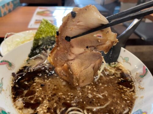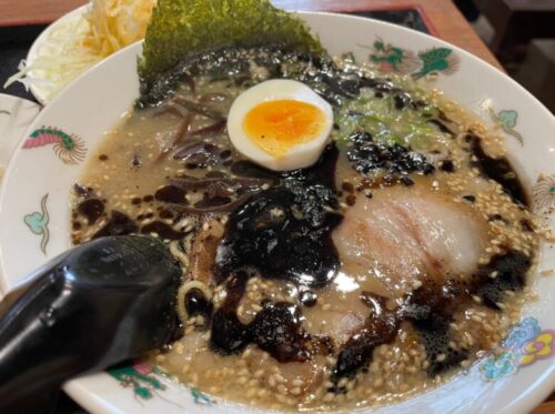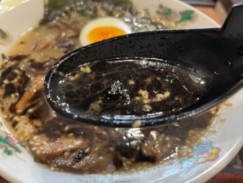 とんこつスープと黒マー油が絶妙に絡み合い、素晴らしい美味しさ…!