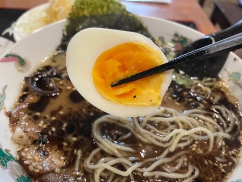 ゆで卵もいい感じの半熟具合で、そのほかのトッピングはきくらげや海苔やネギ…と熊本ラーメンらしい具材です。