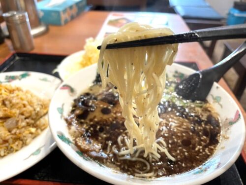 ラーメンの上には、真っ黒な黒マー油がたっぷり。