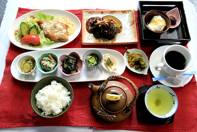 新鮮な食材を使った豪華なランチは、肉料理と魚料理で一種類ずつに、野菜の小鉢5種、ご飯、お吸い物、サラダ、コーヒー、デザートまでついて、フルコース並みのボリューム!