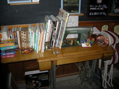 店内にあるミシンやピアノは、熊本地震の際に捨てられる予定だったものを再利用。