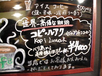 お店ではこだわりのコーヒーが用意されていますが、その中でも一番のインパクトは、世界一高級なコーヒーといわれる「コピ・ルアク」です!