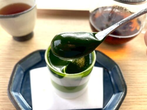 抹茶は、同じく相良村の「信國製茶」にオリジナルで作ってもらったという人吉藩抹茶。川辺川の清流を灌水して作られたという美味しい抹茶で、苦みもなく、甘さも控えめで、とても上品な味わいです。