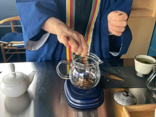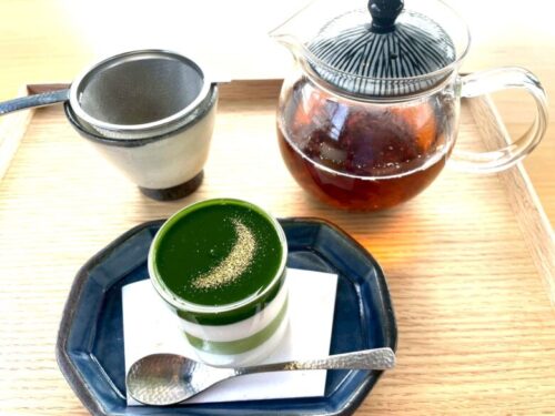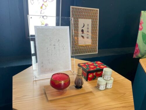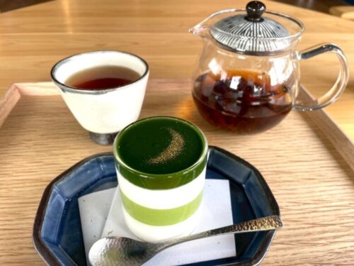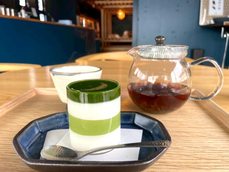 カフェスペースでは、こちらのお店オリジナルの三日月のお茶(緑茶・和紅茶)と、抹茶を使った甘味を愉しむことができます。