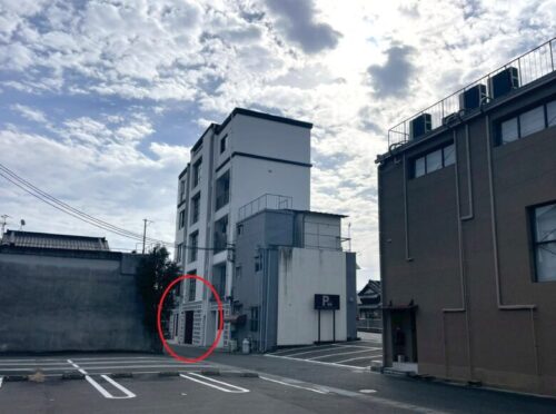 こちらのお店、入口がわかりづらいのですが、ビルの裏側の下記の赤丸部分に入口があります。