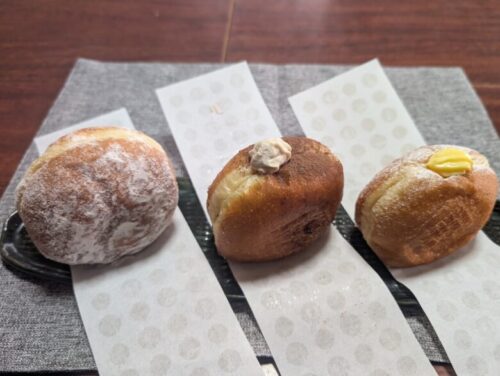 並べてみると…クリーム入り右2つのドーナツは重さで下に沈んでますね!