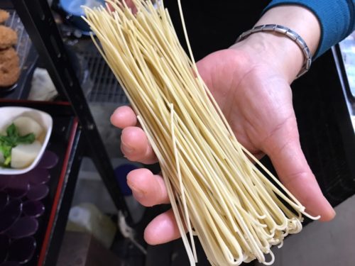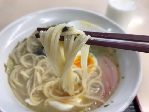 牛乳入りの麺は白っぽく、細麺ストレート。食べてみると、なんだか優しい味わいで、子どもにも良さそう!