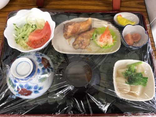 この日の日替わりは、メインの手羽元の照り焼きに、カブの煮物、これにサラダや明太子までついて600円という安さ!