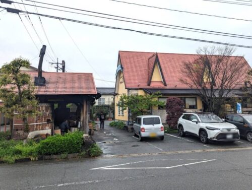 まず煙を上げる煙突の立つ小屋が見えます。その先にある森の中の小屋のような建物が店舗です。