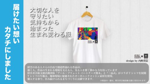 《アール・ブリュット パートナーズ熊本》✖️三益式とのコラボTシャツ(100%オーガニックコットン)を制作し、受益金の一部を障害者芸術支援に寄附をして、ハンディキャップを持っているアーティストの芸術活動支援をされていたり