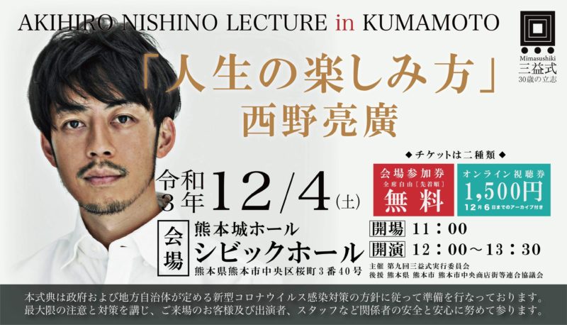 「今回は、12/4熊本城ホールで、漫才コンビのキングコング西野亮廣さんを招き、「人生の楽しみ方」の講演会を無料で開催します!しかも、今回は30歳と限定せずに、年代問わずにどなたでも来て頂いて構いません!」