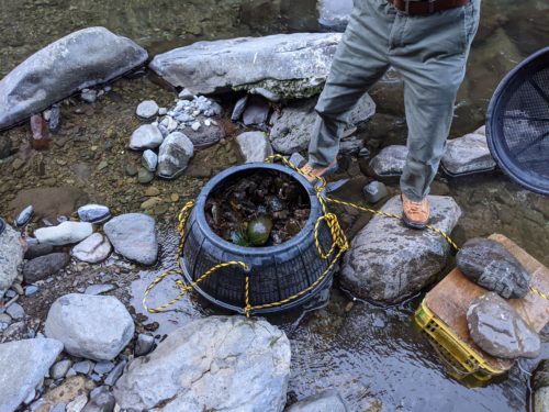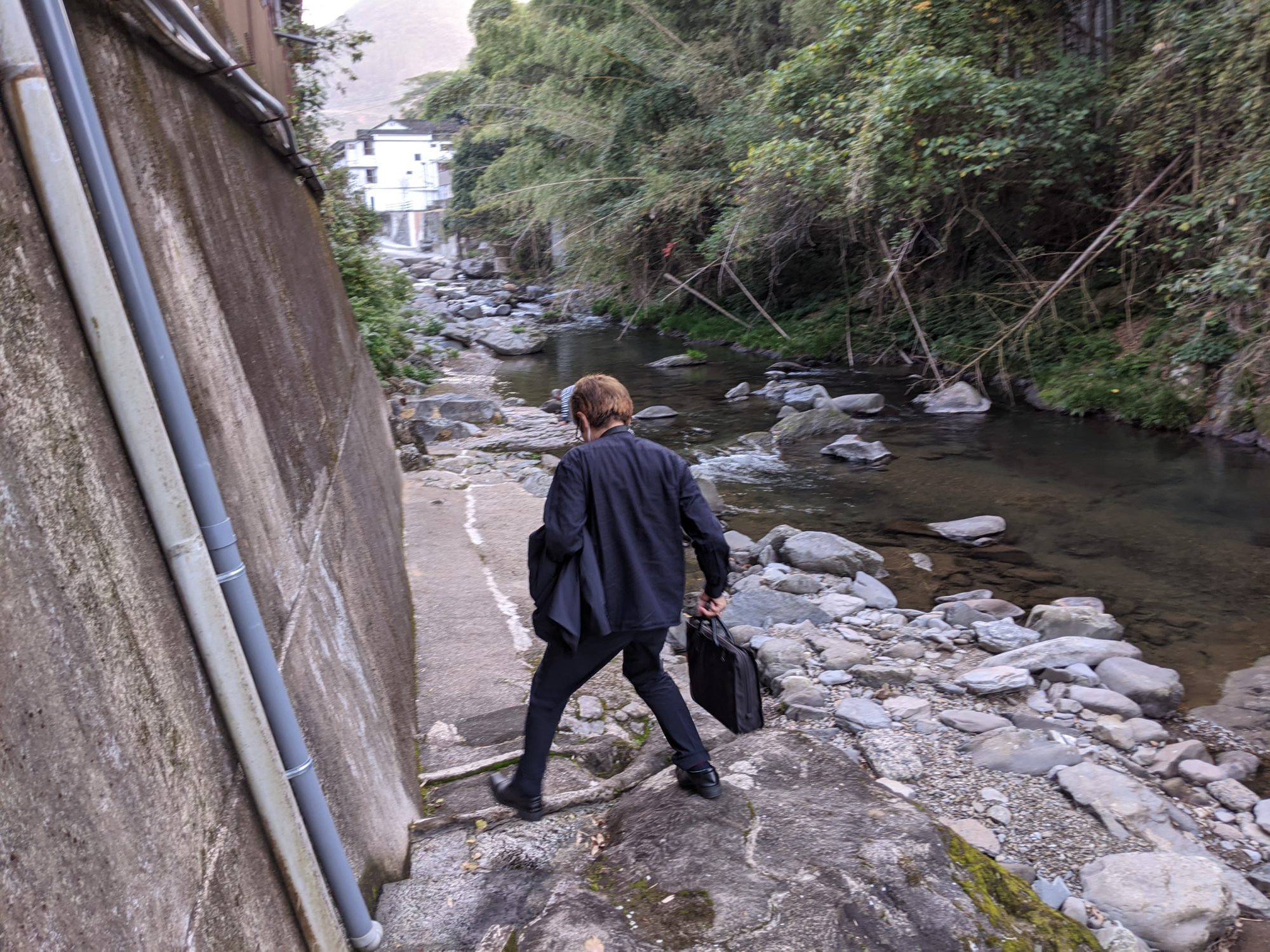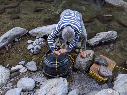 階段を降りるとそこは川ッペリ(川沿い)、するとさっき「かしわぎ」でみた物体が。