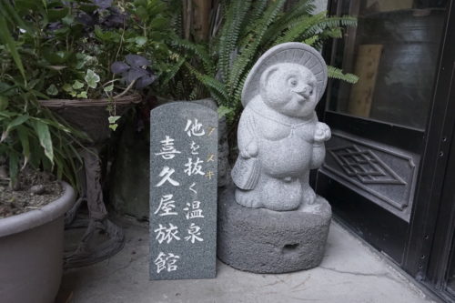 「他を抜く温泉」とたぬき像が。納得せざるえを得ない泉質でした。
