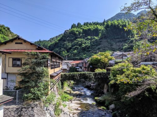 湯出川を挟んで、宿と道が1kmほど続く温泉街です。