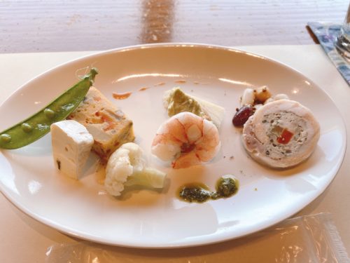 まずは前菜。地元で採れた野菜を使用し、どれもシェフの手作りで優しい味。ソースも手作りで味が繊細。