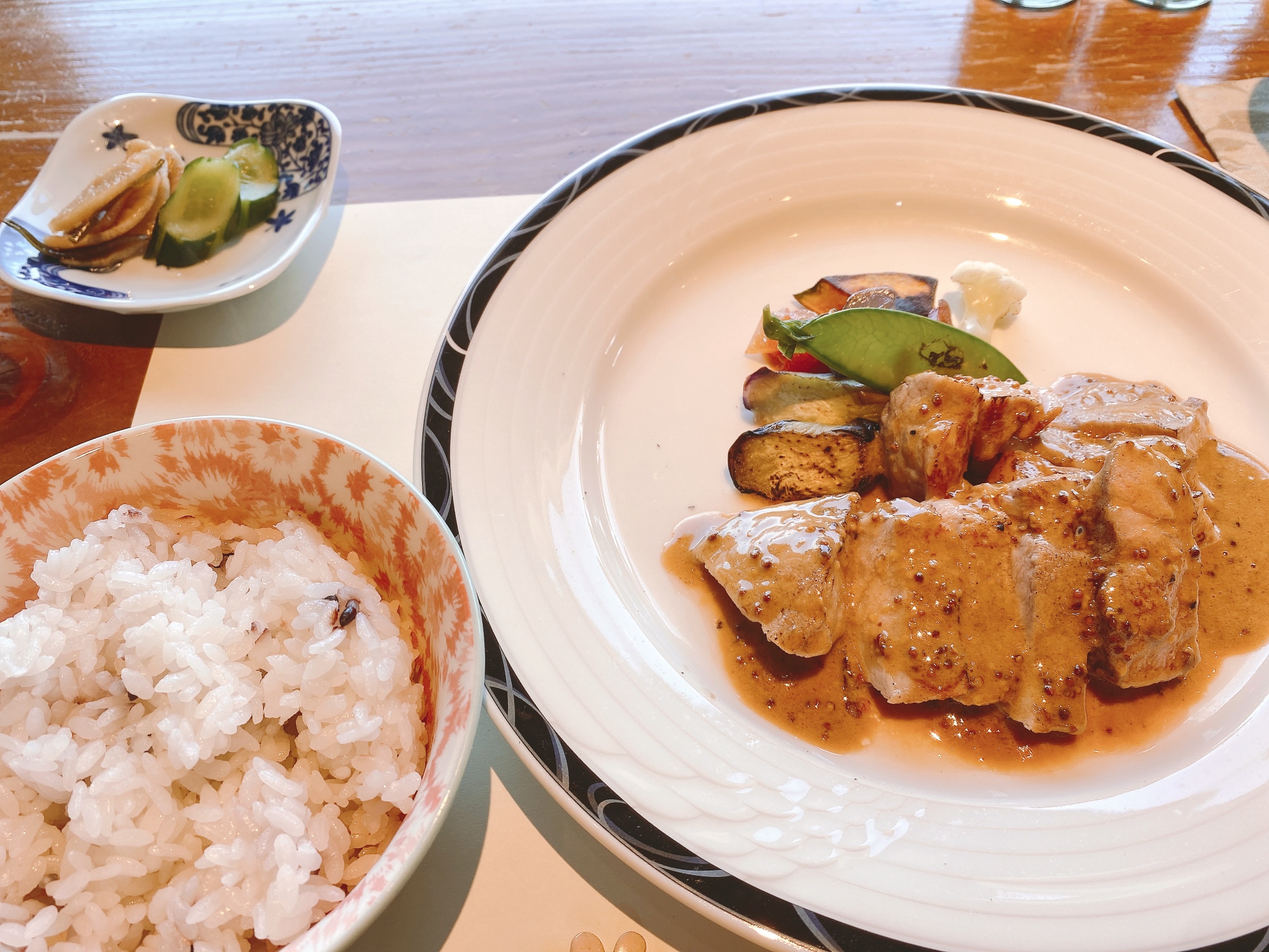 メインの「粒マスタードソースのポークソテー」ごはんは雑穀米です。