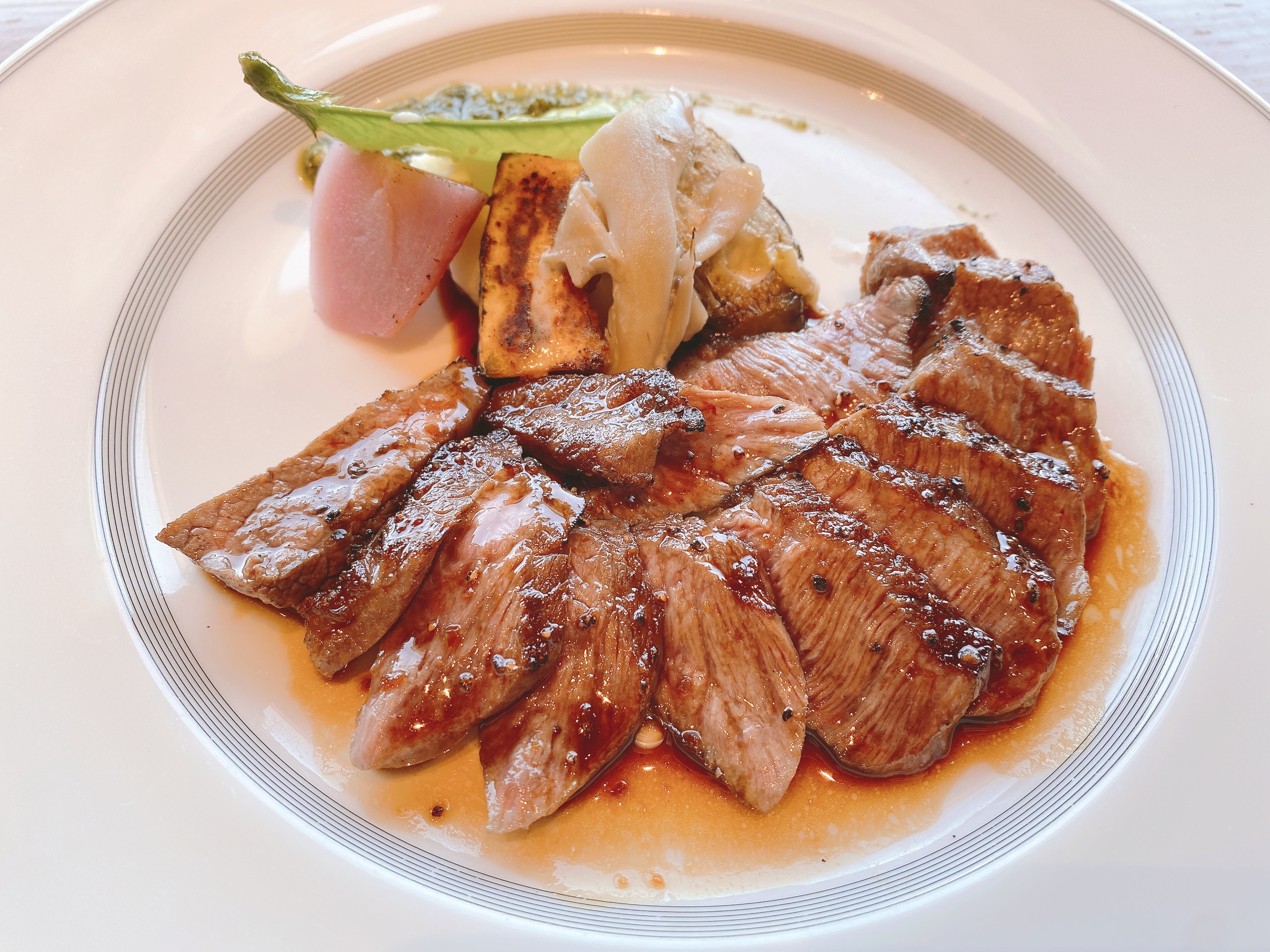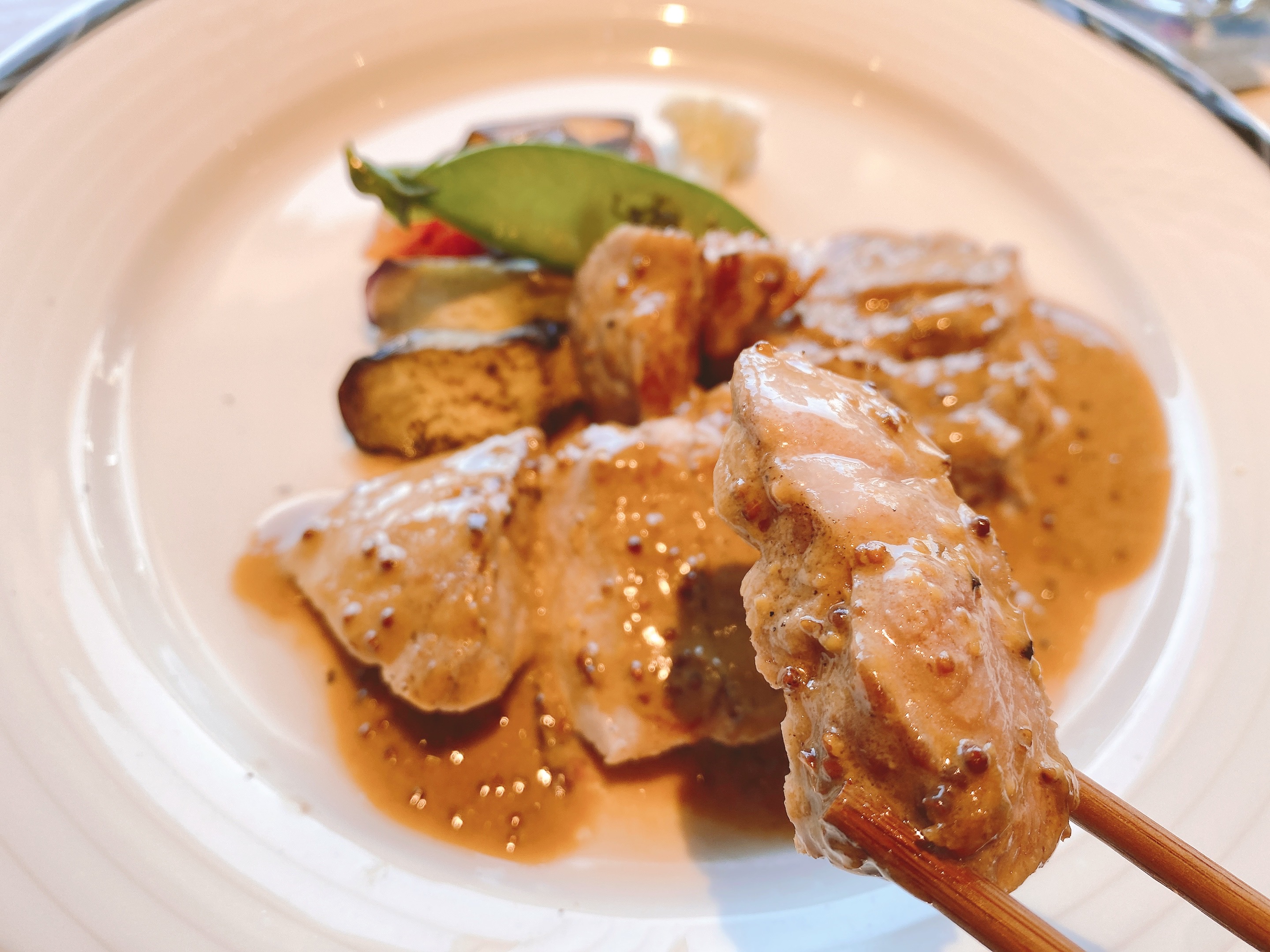 ポークソテーは柔らかく、粒マスタードソースも辛すぎず、マスタード本来の味がしっかりとしてポークソテーとの相性は最高!豚肉とは思えない柔らかさとジューシーな食感。
