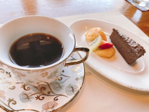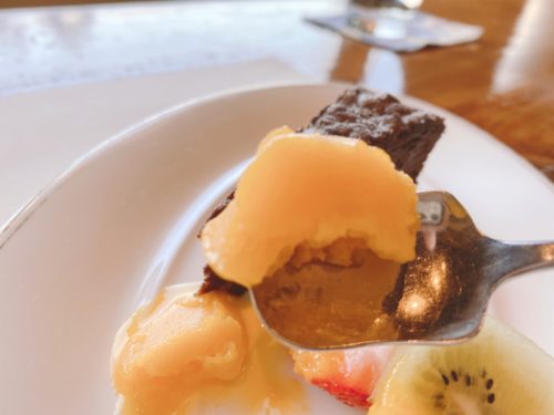 マンゴーのシャーベットはマンゴーをそのまま凍られてあるのではないかと思うくらいのマンゴー感。チョコレートケーキも甘すぎず、コーヒーとよく合います。
